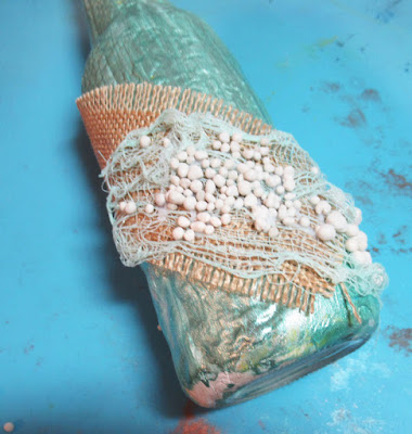 Once dry, I painted the entire bottle with Prima Mermaid Tears for a pretty light blue effect. Next, I wrapped burlap partially around the bottle and glued mesh on top.